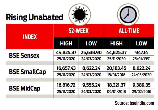 Having added over 1,000 points every month since May this year, the BSE Small-Cap and Mid-Cap indices had zoomed 95 per cent and 77 per cent, respectively, by November 27. These, however, were below their all-time highs of above 20,000 points and more than 18,000 points, respectively.