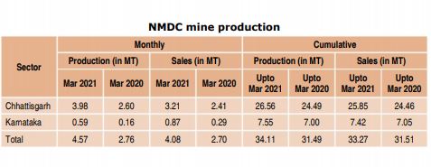 Iron ore sales during FY21 increased by 6 percent to 33.27 mt as against 31.51 mt in FY20.