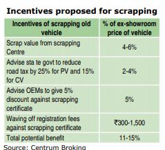 Direct incentives under the policy include a scrap value for old vehicle (ranging between 4-6 percent ex-showroom price of a new vehicle), 5 percent discount on the purchase of a new vehicle against the scrapping certificate and registration fee waiver.