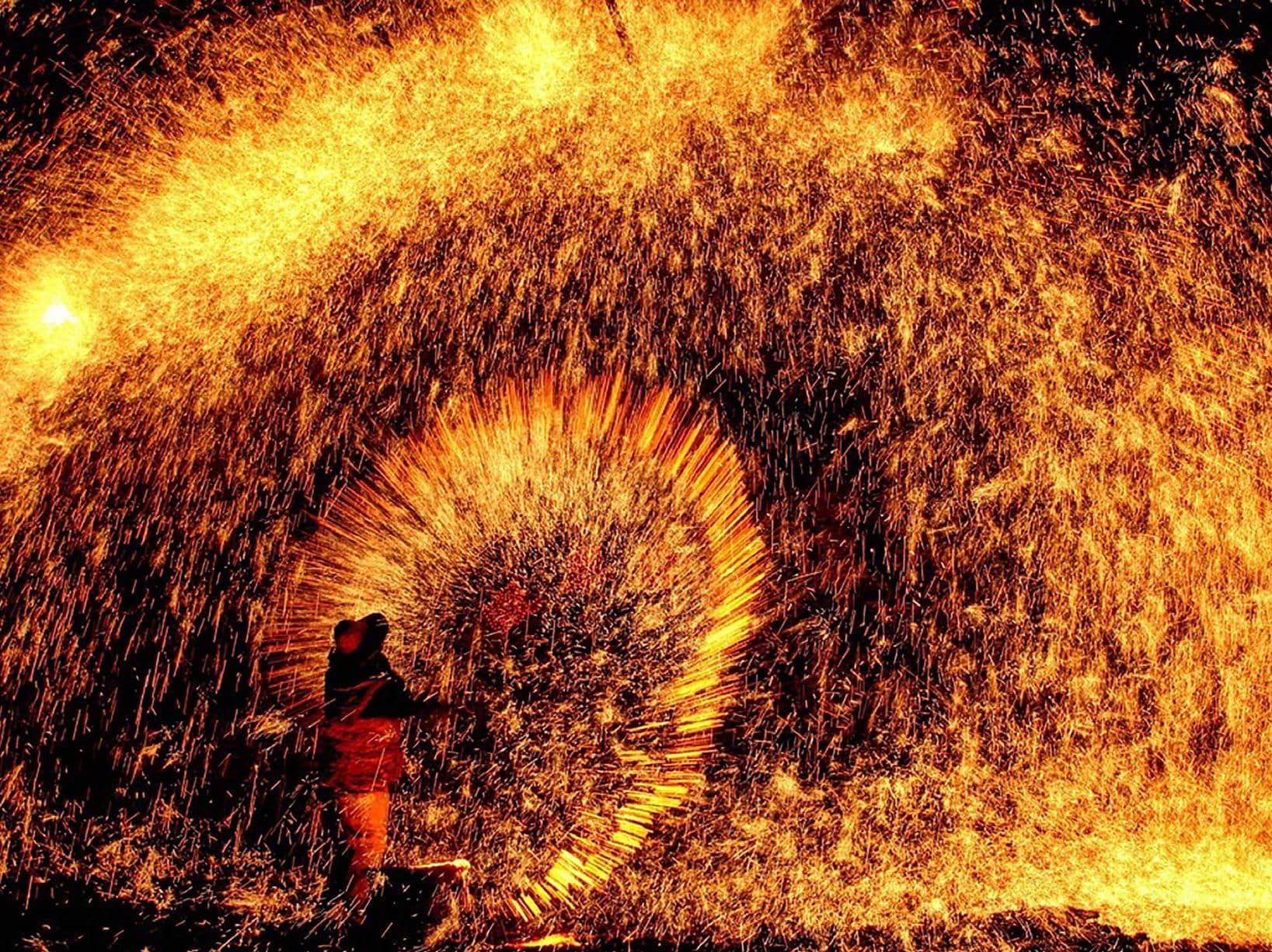 Da Shuhua is a Chinese Festival of Lights tradition in Nuanquan Town with a history of more than 500 years. Dubbed the “poor man’s fireworks” – in reference to the blacksmiths who first indulged in this procession – it is celebrated by throwing molten iron against cold bricks to create showers of sparks. Da Shuhua literally means “beating tree flowers”, a name born from the agricultural practice of hitting fruit trees to stimulate growth. The blacksmiths in Nuanquan named the art form as such because the outcome of it has a shape of a leafy tree canopy. Da Shuhua has been classified as one of China’s significant examples of intangible cultural heritage by UNESCO. It marks the start of the Dragon Boat Festival and is also used to celebrate the Lunar New Year in China.