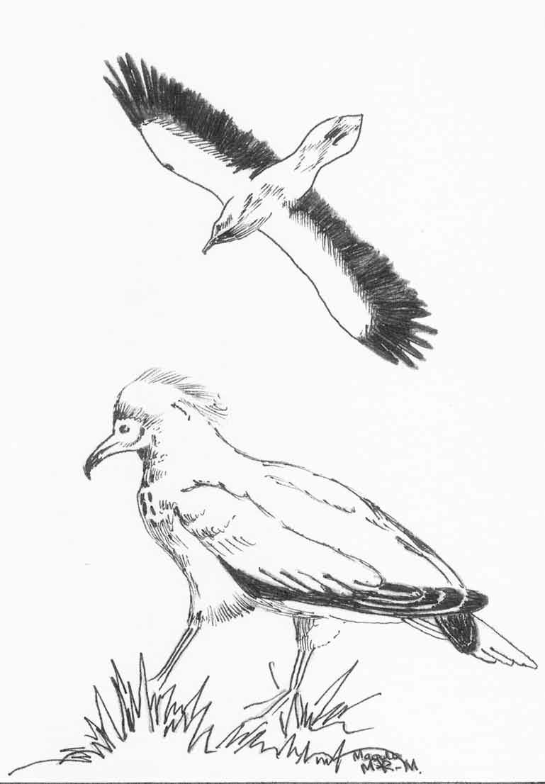 The Egyptian Vulture (Neophron percnopterus) is one of the smaller vulture species. In Southern Africa other small species also occur, e.g. the Palm-nut Vulture (Gypohierax angolensis) and the Hooded Vulture (Necrosyrtes monachus). The Egyptian Vulture (see opposite) can be found in Africa, Arabia and India. In the Republic of South Africa they can only be found in certain areas to the East of the country, e.g. Zululand (Kwa Zulu Natal). In Namibia they can be found in a large area in the North-West near the Angola border.