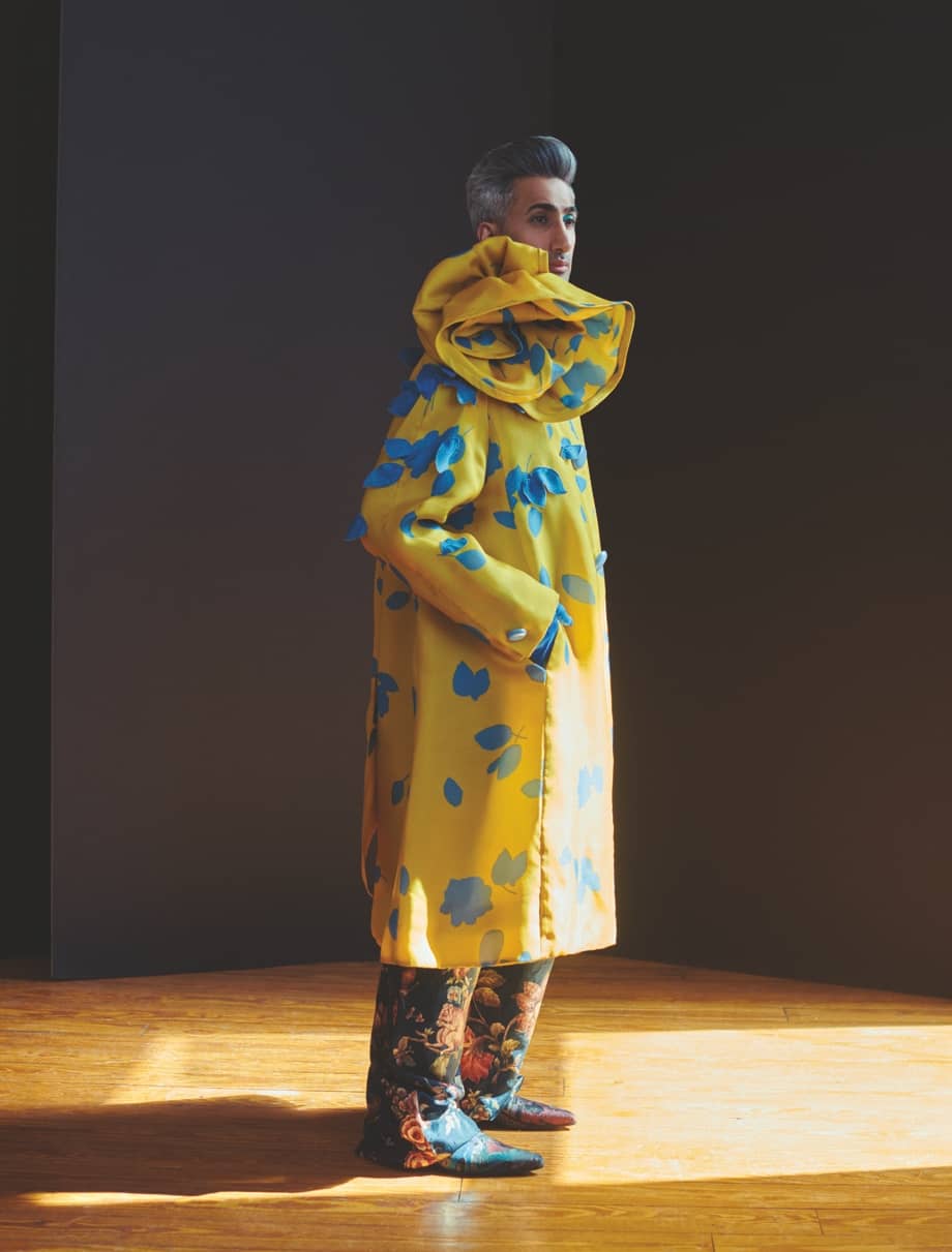 “I had exactly six days off last year; I’m trained for this, don’t worry,” is Tan France’s reassurance to me when I suggest he take a minute to recover from the eight hours of nonstop photo-taking, where he’s been twirling in a Moschino couture cape and a sequinned jumpsuit, balancing a series of elaborate floral headpieces, and tottering in six-inch thigh-high platform boots shaped like Pikachu. His schedule has been like this ever since he went from wholesaler of modest clothing for a largely Mormon clientele to one of the stars of Netflix’s Queer Eye, where he became the sartorial soothsayer to an enraptured nation that couldn’t get enough of his French tucks, his wry sunniness, and that impeccable, immovable quiff. “I feel like the luckiest boy in the world because I got this extra career that I never planned on,” he says.
