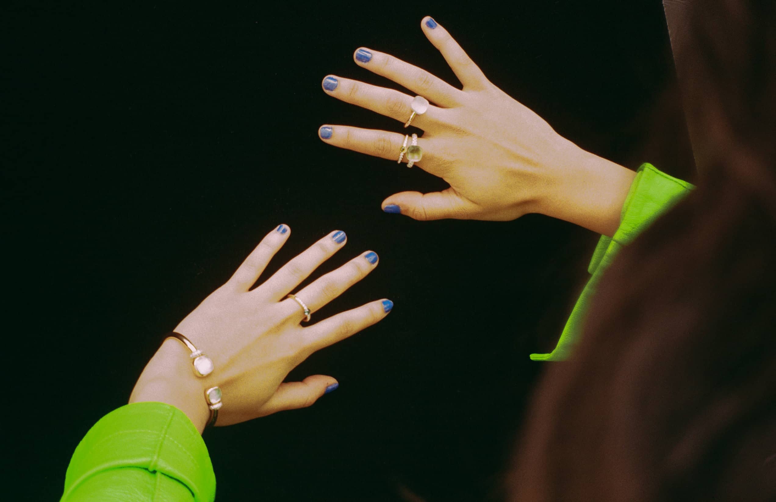 Abrigo de piel, SALVATORE FERRAGAMO. Brazalete Nudo de oro rosa con topacio blanco con madreperla e incrustaciones de diamantes, anillo Nudo Gelé de oro rosa con topacio blanco gelé con nácar, anillo Nudo de oro rosa con cuarzo verde y anillos M’Ama Non M’Ama de oro rosa con incrustaciones de diamantes, cuarzo verde y perito, POMELLATO.