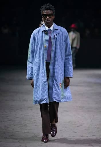 With celebrity guests such as Anderson Paak, Tyler the Creator, Kelvin Harrison Jr, Jared Leto, Mark Ronson, Phoebe Collings-James, South Korean singer Kai and Japanese rock star Miyavi filling up the front row, a giant Foucault pendulum swings back and forth at the centre of the show space at the Palazzo Delle Scintille, which at the same time, marks a distinct line in the sand beneath it. Once the models hit the runway, the pendulum seemingly starts moving in random angles, depicting French philosopher Léon Foucault’s outline of a non-linear of time much like Michele’s perception of fashion.