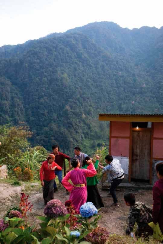 ARRIBA Aldeanos celebrando una boda lepcha, bailando en las montañas en el pueblo de Keshel.