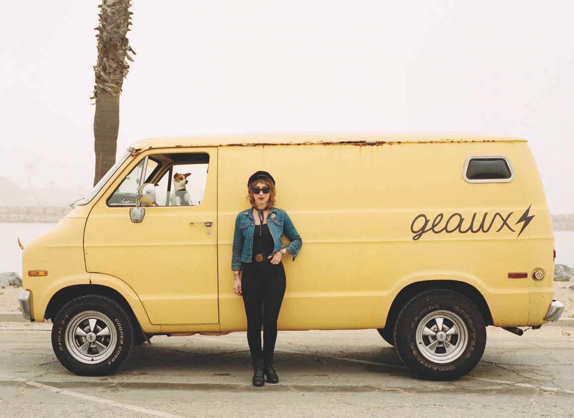 “As an artist, whatever you touch is a reflection of you,” she offers, maneuvering the vehicle’s massive steering wheel. “I very much feel like the van is a part of me, and I’m a part of it.” With Hamrock’s nickname “Geaux” emblazoned on the auto’s side, it’s clear that relationship is real. The lightning bolt punctuating the moniker is also pretty telling: “I love that my salon anchors me to Long Beach,” she says, “but whenever I have the chance to split, I get the hell out of Dodge.”