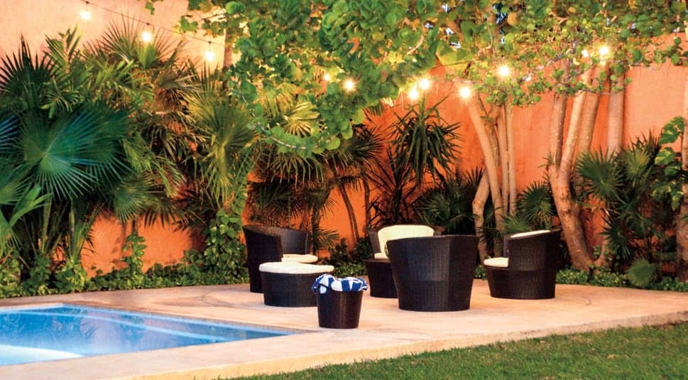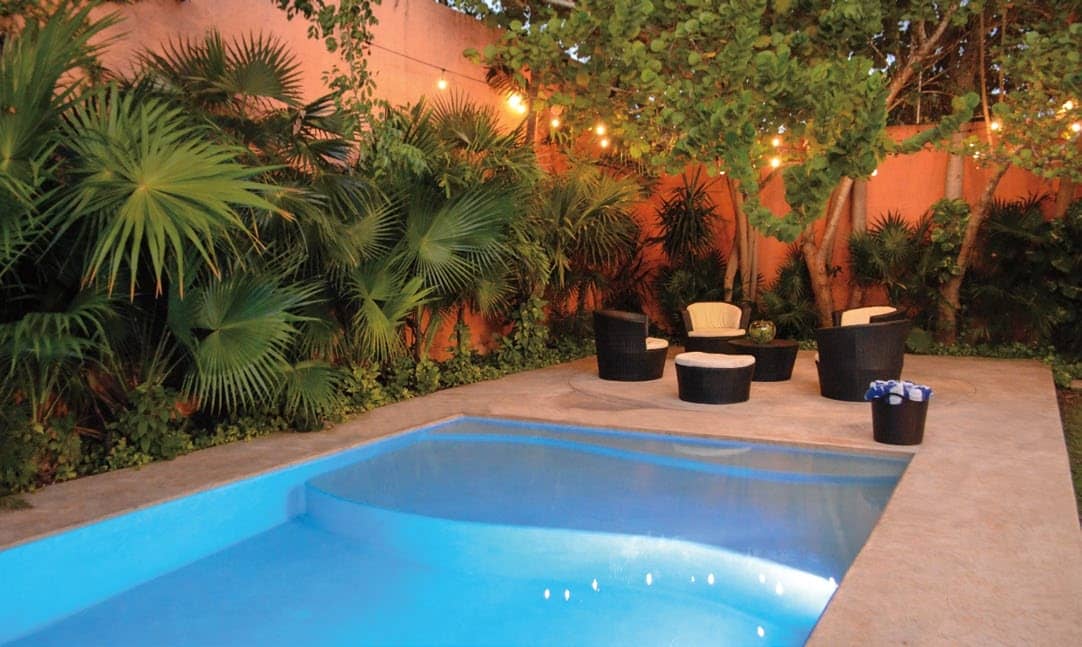Nos gusta mucho estar en espacios exteriores y, por lo tanto, es allí donde podemos disfrutar en familia, así como en reuniones o cenas con amigos. Las plantas seleccionadas para este patio son todas de la región. Se combinaron diferentes tipos de palmáceas como el chiit (Thrinax radiata), varios árboles de uva de playa (Coccoloba uvifera), un maculís rosado (Tabebuia rosea), matas de chunup a manera de seto (Clusia flava), y un chaká (Bursera simaruba). Las uvas de playa han formado una amplia fronda que produce una sombra muy agradable en la terraza, la cual sirve de dosel para abrigar las reuniones que hacemos en la terraza. Los pavimentos que rodean la piscina son de cemento blanco y piedra caliza de la región ligeramente texturizados emulando, al igual que el fondo de la piscina, la arena de la costa. Por otra parte, el césped es de pasto americano y está nivelado para permitir juegos y reuniones de manera funcional.
