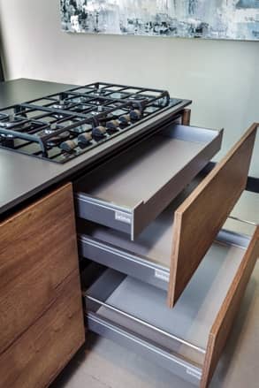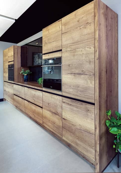 Cocina diseñada con puertas, cajones y electrodomésticos panelados en color Roble Havana; cuenta con armarios altos con vidrio negro y muebles con puertas de vidrio y luz integrada, de Ixina Cocinas Integrales. Florero, de Arteuropeo. Fotografía: Iván Cabrera.