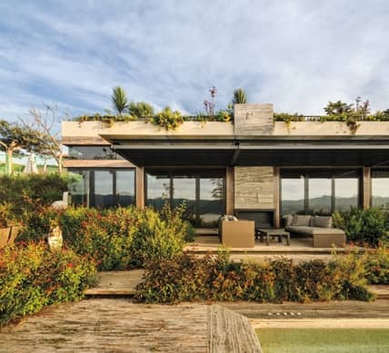 Ubicada en un sitio privilegiado cercano a La Peña, donde las construcciones se han apropiado del paisaje, fue una prioridad para el diseño desaparecer lo más posible. El terreno original contaba con un desnivel en terrazas desde la calle hasta el agua, mismas que dictaron el emplazamiento del proyecto. La casa cuenta con cuatro recámaras, más dos de servicio. Bajando la escalera, un generoso espacio de techos altos en el segundo volumen funciona como sala y comedor, flanqueado por jardines y terrazas; al sur, con salida a la alberca, y al norte conecta con la cocina y lacancha de padel. Tres recámaras y un family room se encuentran en la planta alta del primer volumen, con vista al techo verde. Sobre la conexión entre los dos volúmenes se encuentra la terraza de la tarde con un jacuzzi rodeado por el mismo jardín.