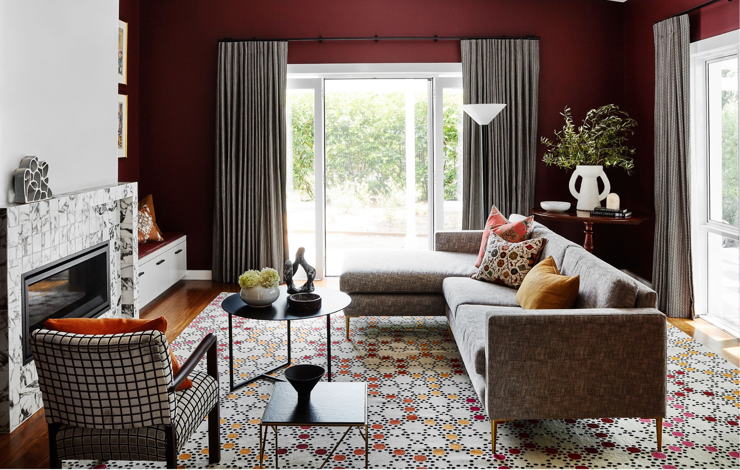 The Bernabeifreeman ‘Mosaic’ rug from Designer Rugs was the starting point for the design of this cosy living room. Sculpture on mantel by Natalie Rosin, Curatorial+Co. Gas fireplace, Highland Fires & BBQs. Pulp tiles, Di Lorenzo Tiles. The occasional chair is a family heirloom. Custom sofa by H+J Furniture. Alison coffee table and Pam side table, both Savage Design. Vintage floor lamp. Walls painted Dulux Unforgettable (chimney breast) and Dulux Red Vine. On coffee table: Sculpture by William Versace, white bowl from Ondene, marble dish by Greg Natale. On corner table: White bowl from Ondene, Serax vase from Becker Minty, travertine box by Greg Natale.