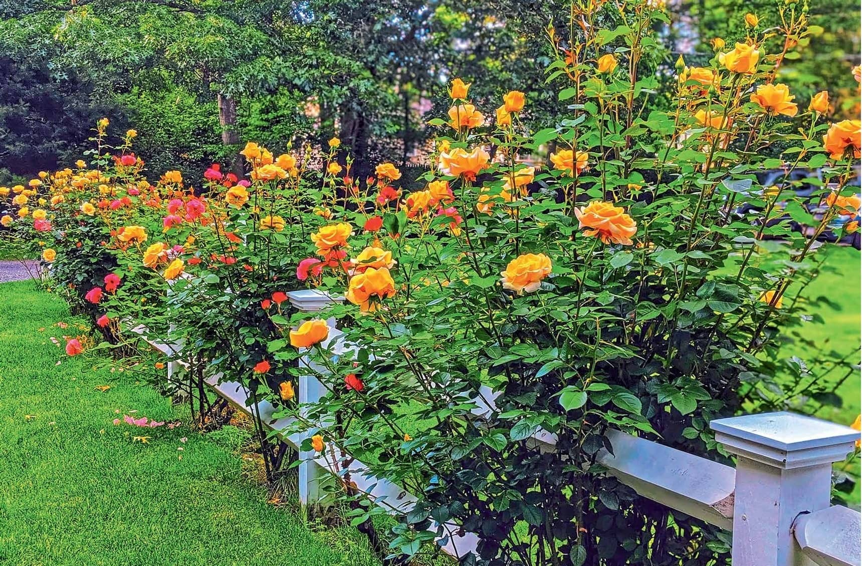 2 BORDER FORCE Dress up your cottagey split-rail fence with beautiful red and yellow floribunda rose bushes that will grow up and around the bottom rail and embrace the top rail.