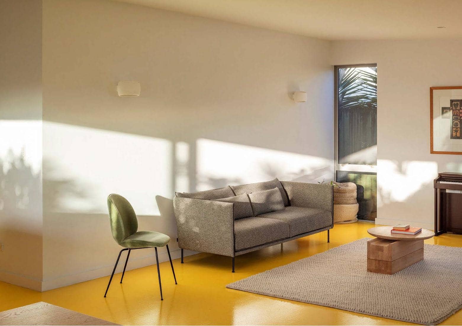 From the front, the house is a classic 1940s bungalow on a quiet suburban street, but head out back and you’re in a different time-space continuum altogether. Facing a luscious garden of native plants that attract tui and piwakawaka, a generously proportioned, aluminium-clad verandah, seemingly plucked from the set of The Jetsons, sparkles in the sun, while inside, the golden floor radiates.