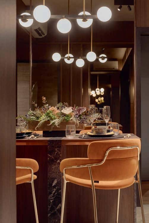 The designers focused on creating a thematically holistic space. To maintain a cohesive flow through the show apartment, a walnut wood-tone panelling was chosen as the main material to clad the walls throughout the unit. Even the ceilings are covered with lightertoned panels instead of leaving them bare to reduce the contrast between the walls and ceiling. Special care was taken to choose the exact shade of walnut, Hun adds, to ensure the apartment exudes a warm and welcoming atmosphere.