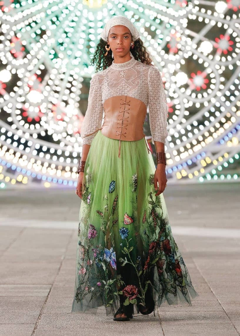 The Mediterranean If it weren’t for Covid-19, Virginie Viard would have set Chanel’s Resort 2021 against the scenic surrounds of the Mediterranean Sea. So instead of designing with the Capri in mind, she decided to work the collection around the glamorous and free-spirited jet-setter. Viard’s day-to-night wardrobe focused on the bandeau top, which featured in various looks. One salmon-pink tweed thriller offered lemon-yellow embroidery and sequin embellishment, and was teamed with a matching jacket and blue jeans. Another, in lively bougainvillea pink and encrusted with mosaic-inspired silver embroidery, perked up a striking purple tweed skirt suit. Here’s the idea: one can wear the bandeau top on its own during the day, then throw on a jacket for evening cocktails. To create “a wardrobe that can be carried in a little suitcase on wheels, a shopper and an embroidered handbag”, Viard also experimented with multipurpose pieces. Maxi skirts could be hiked up and worn as strapless midi dresses while light-as-air chiffon jackets doubled as poolside cover-ups. Even a lamé draped dress could be untied and worn as a sweeping robe. Viard also took the opportunity to showcase a standout selection of accessories, such as a quilted shoulder bag fully embroidered with clear sequins, to evoke the warmth of the setting sun.