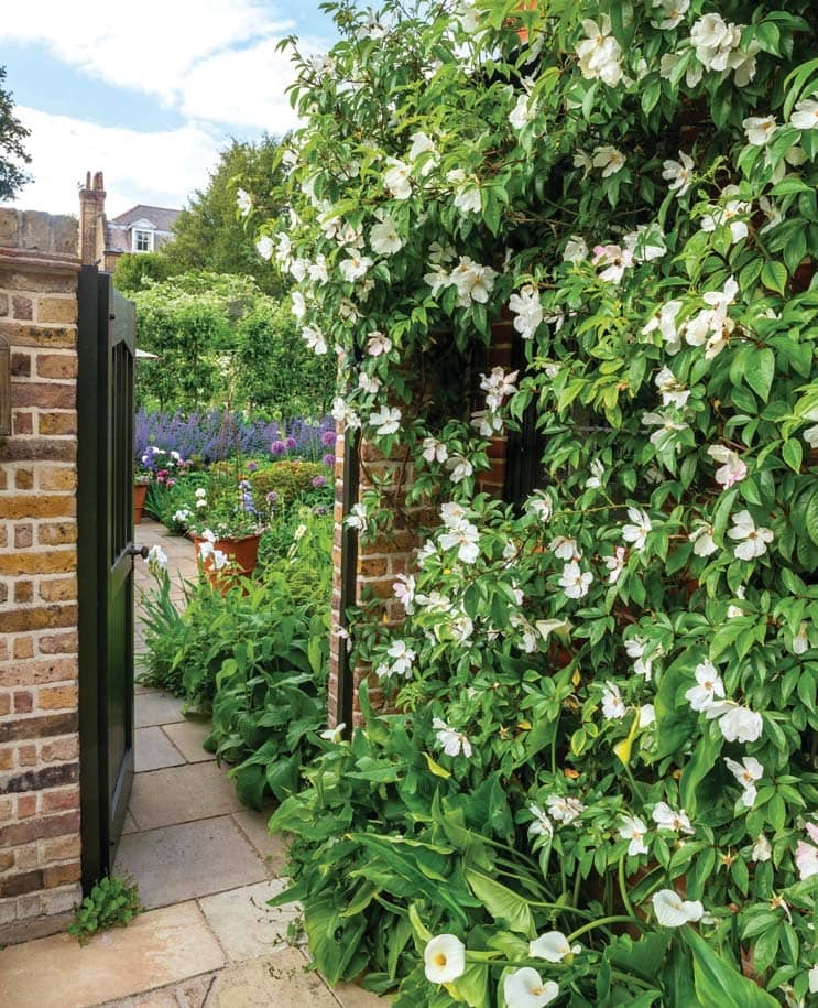 When Rebecca Glassberg moved here in 2017 with her husband and their young family, the garden had been mostly laid to the terrace for entertaining outdoors, but she had a very different vision for the red-brick Arts-and crafts house, which dates from 1910. ‘I wanted something with more color and more plants and to feel the seasons changing,’ says Mrs Glassberg. ‘I like to see a garden overflow with plants—that kind of Sissinghurst madness —so it all looks unplanned and busy.’