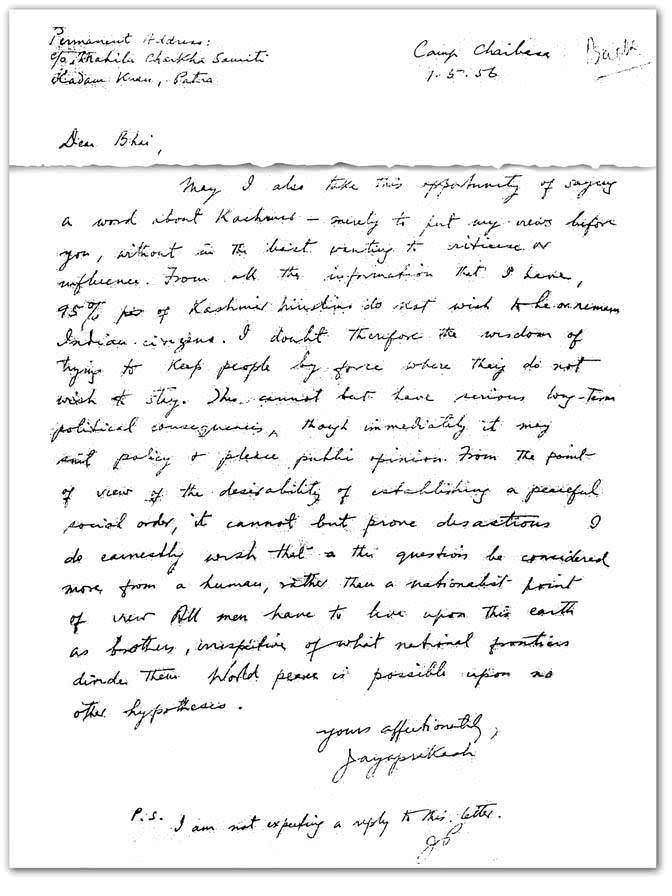 “From all the information that I have, 95 per cent of Kashmiri Muslims do not wish to be or remain Indian citizens. I doubt therefore the wisdom of trying to ‘keep’ people by force where they do not wish to stay. This cannot but have serious long-term political consequences, though immediately it may suit policy and please public opinion.”—Jayaprakash Narayan’s letter to Nehru, May 1, 1956 (Bimal Prasad (Ed.), Selected Works of Jayaprakash Narayan; Vol. 7; Manohar; page 115).