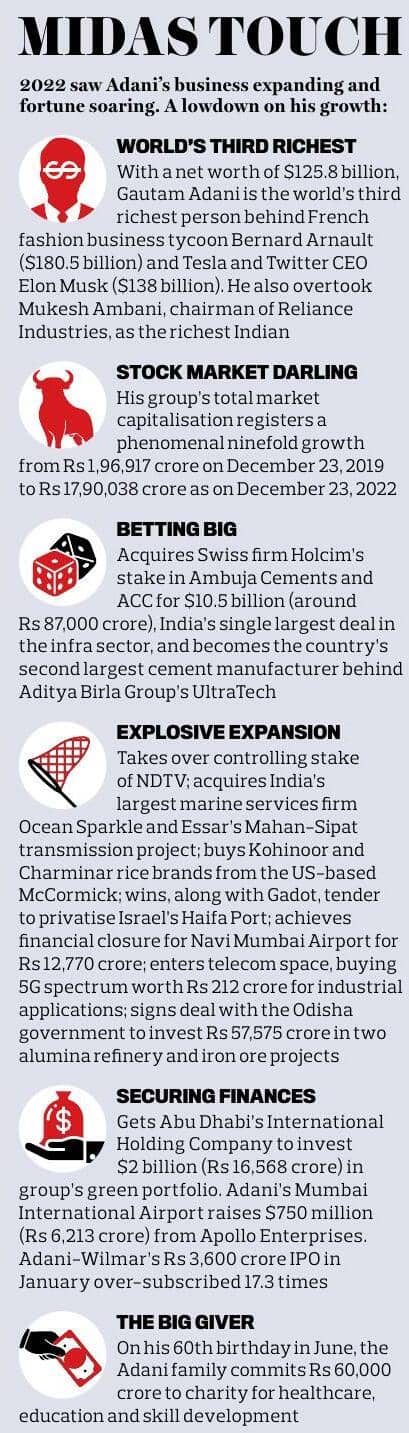 The Adani Group and founder-chairman Gautam Adani’s vision was in full flow in 2022 with much to celebrate. Expanding at an explosive rate, the group’s market capitalisation grew nine-fold in just three years to cross Rs 17.9 lakh crore as on December 23, making it India’s second most valuable firm just behind the Tata Group but ahead of Reliance Industries. Adani even overtook Reliance Industries’ Mukesh Ambani to become the richest person in India and Asia, apart from becoming the world’s third wealthiest with a personal net worth of over 125.8 billion per the Forbes list, as on December 28).