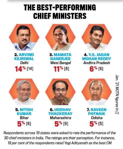Perception management is a critical factor in determining the popularity of a chief minister. No one exemplifies this better than Ut tar Pradesh chief minister Yogi Adityanath, who faces an assembly election in barely six months. Once again, he has emerged as India’s bestperforming chief minister in the August 2021 Mood of the Nation (MOTN) survey, albeit with a significant decline in popularity—from 25 per cent in the MOTN January 2021 survey to 19 per cent now.