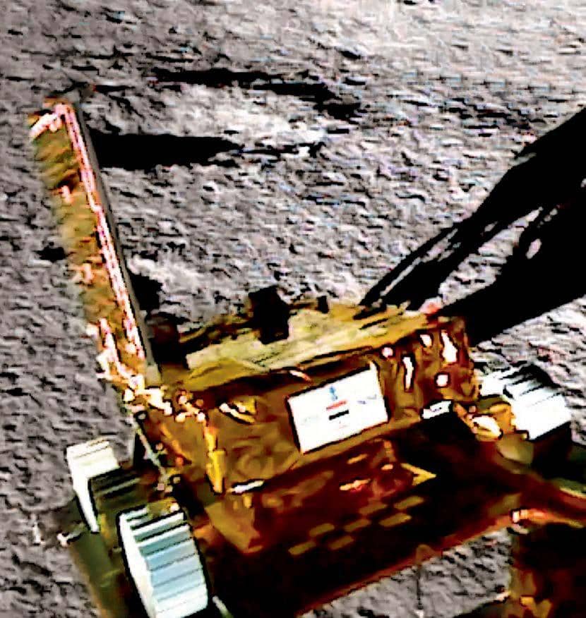 On the MOX porch are displayed real-size models of Vikram, India’s now-famous moon lander, and its companion, the Pragyan rover. They were transported from the UR Rao Satellite Centre (URSC) at the other end of the city for the PM’s benefit. Sheathed in a shiny gold-coloured thermal blanket, Vikram, with its four landing legs, is surprisingly tall—around 10 feet—but has a squat box-like appearance. Weighing 1,742 kilograms, landing it on the moon is like dropping a mini-SUV on the satellite’s surface. Pragyan, the rover whose glistening aluminium wheels bear the imprint of India’s national emblem, resembles an oversized skateboard. ISRO scientists and their families were busy taking selfies with the spacecraft replica before it was dismantled and returned to the URSC.