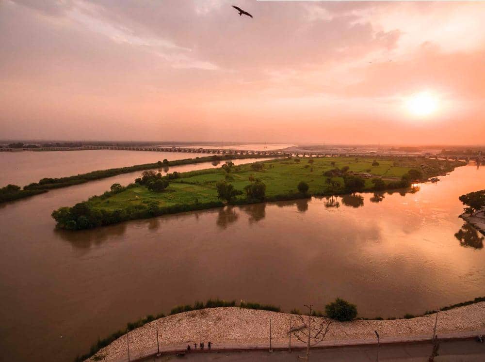 El torrente de las montañas, que se alimenta del deshielo, se expande hasta alcanzar su amplitud total en las planicies de Sind, en el sur de Pakistán. La presa en Sukkur, visible a la distancia, se construyó en tiempos coloniales; encauza el agua del Indo hacia una red de canales para irrigar cultivos como trigo y arroz en el desierto. A lo largo del Indo, los británicos crearon lo que es todavía el mayor sistema de irrigación del mundo.