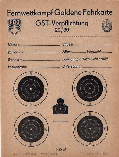 Airgun use was permitted in East Germany, and a 1968 Act explained that use was permitted only where the life and health of people was not placed at risk and security not disturbed. In reality, this meant use at approved ranges or in the performance of professional duties rather than casual use. A 1960s instruction manual for the Haenel 310 series of air rifles informed airgun users they were only to shoot on approved ranges and not at birds or other animals. A fine was payable if the regulations were infringed.