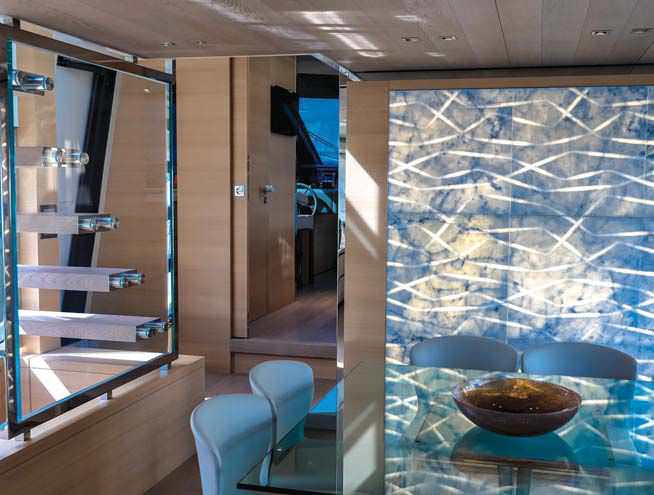 The focal point of the salon, and one that I couldn’t help but touch, was the forward bulkhead: a huge panel of hand-carved Carrara marble backlit with an LED film that illuminated the entire surface without dark spots. It was the perfect backdrop for dining, and a serene pleasure to view.