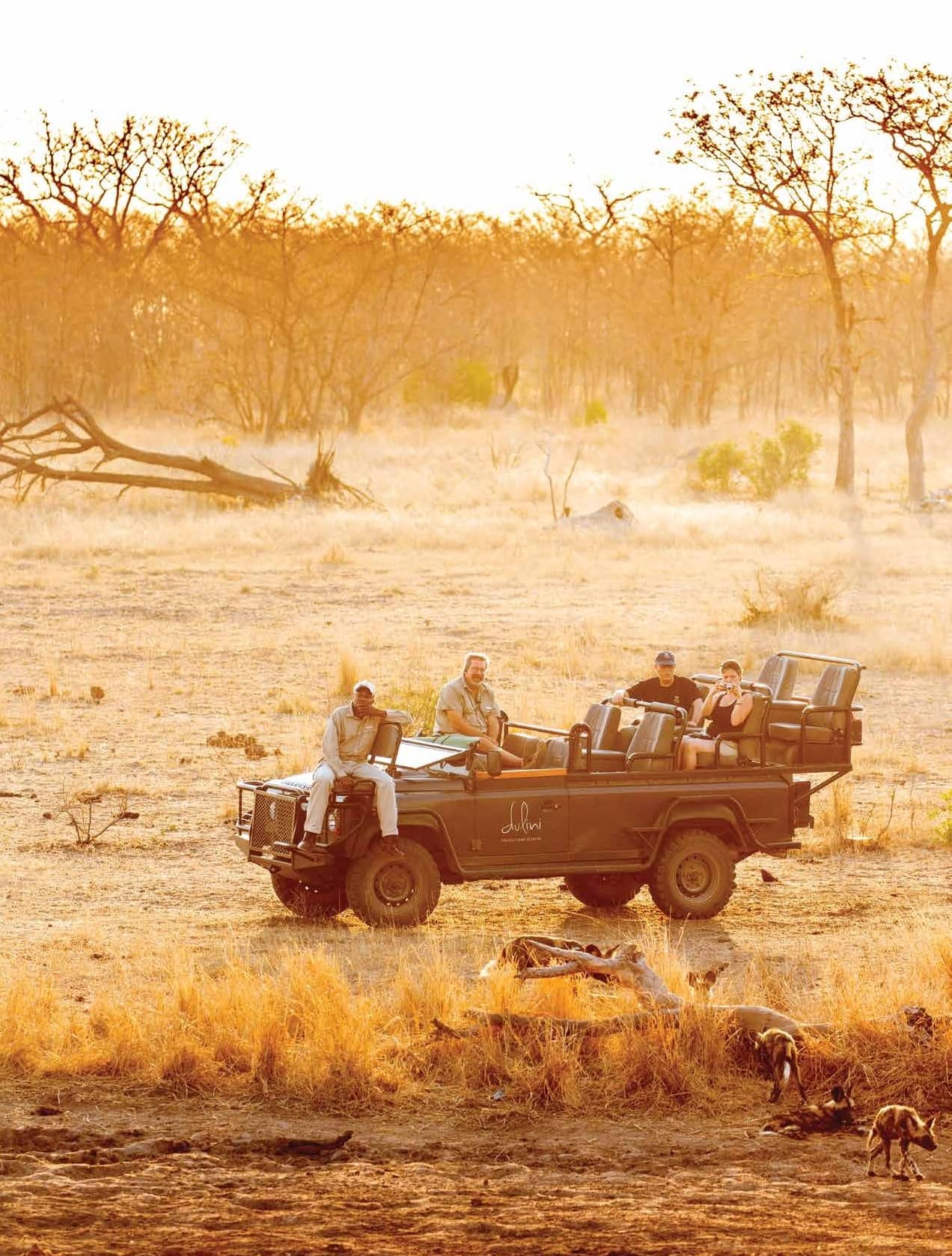 On the ground though, the outlook is more promising. Busy drooling over the lunch menu at Dulini River Lodge, we almost don’t notice the three giraffes that appear above the jackalberry trees. Their slow, lumbering gait draws them closer to the perennial Sand River that lies between us. A large kudu delicately picks his way along the bank to drink from the shallow pools and a troupe of baboons start to bark downstream. Staff hurry to check that windows and doors are closed against the opportunistic marauders. And then, elephants. The grey hulking shapes lumber towards us as we sit on the deck under the sausage tree, scarcely believing our luck. Twenty minutes into lunch and we needn’t even go on the afternoon game drive!