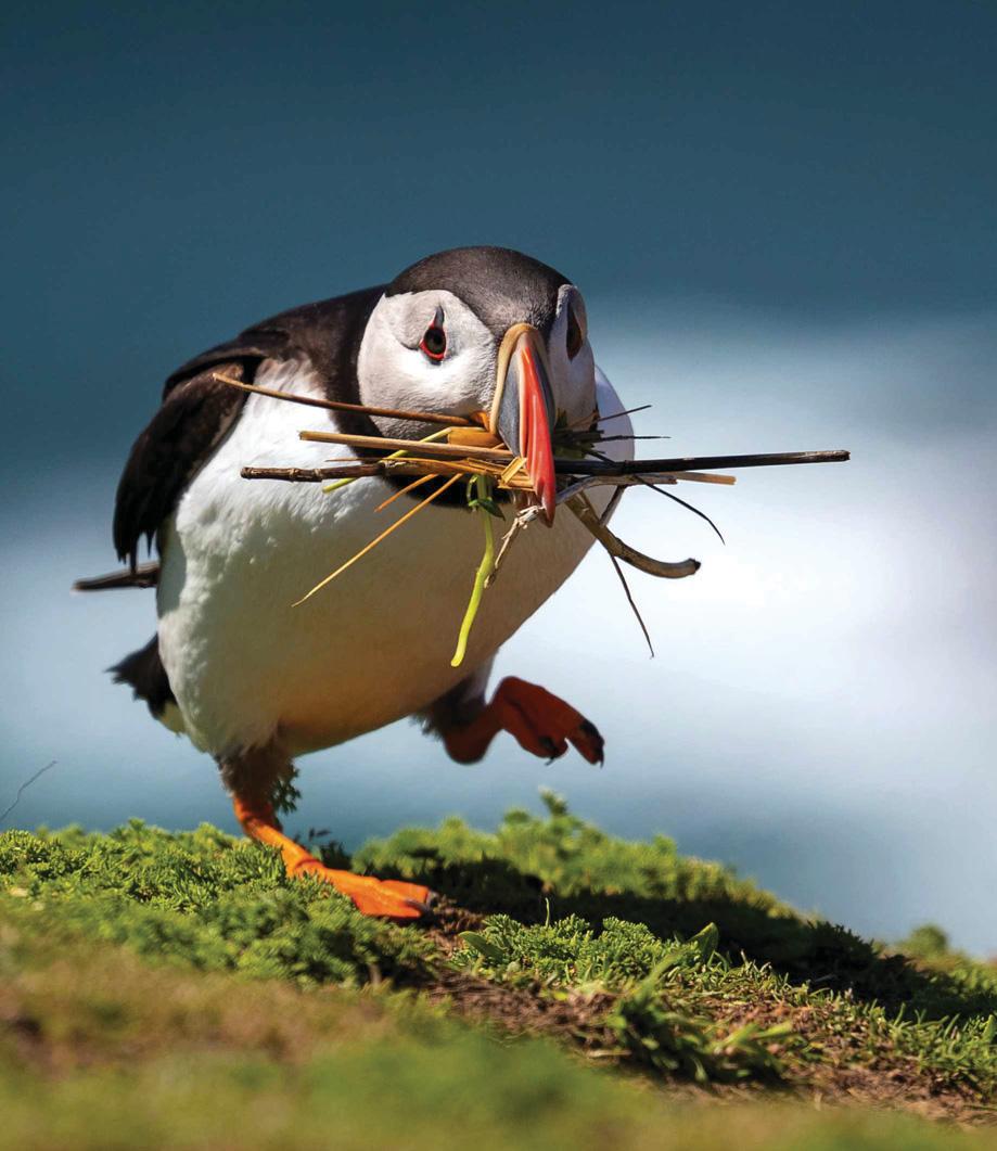 A puffin gathers grass and roots to line its burrow. Its large, vividly coloured bill - prominent in summer, a duller hue in winter - contrasts with the smart black and white of its plumage, said to resemble monastic robes. This look informs the species' scientific name, Fratercula arctica, 'little brother of the north' - a nod to its range in the north Atlantic.