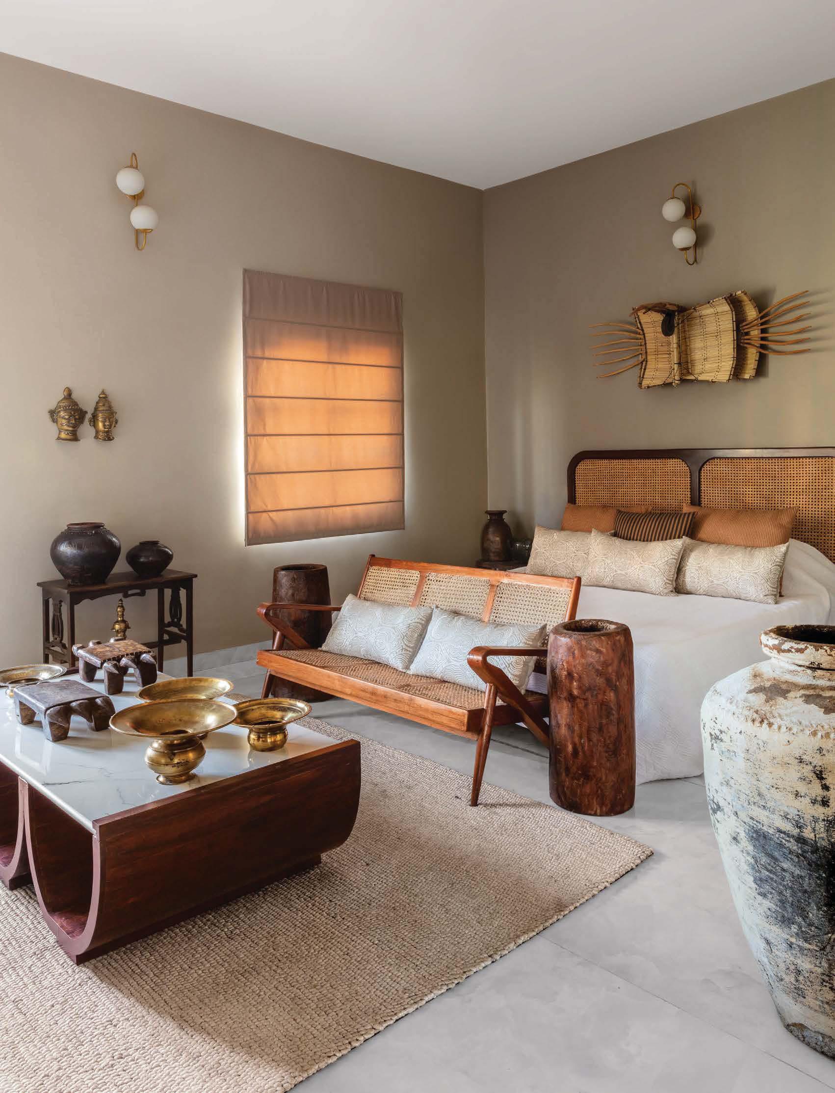 THE GUEST BEDROOM FEATURES A KING-SIZE BED DESIGNED BY TAHIR, AND ABOVE IT, A WALL ANGEL. NAGA GRAIN POTS FLANK EITHER CORNER OF THE BED, WHILE A TALL POT, SOURCED FROM THE DESERTS OF WESTERN INDIA, STANDS GUARD TO THE RIGHT. THE TABLE HOLDS AN ARRANGEMENT OF OLD SPITTOONS AND NAGA STOOLS THAT DOUBLE AS CHEESE BOARDS.