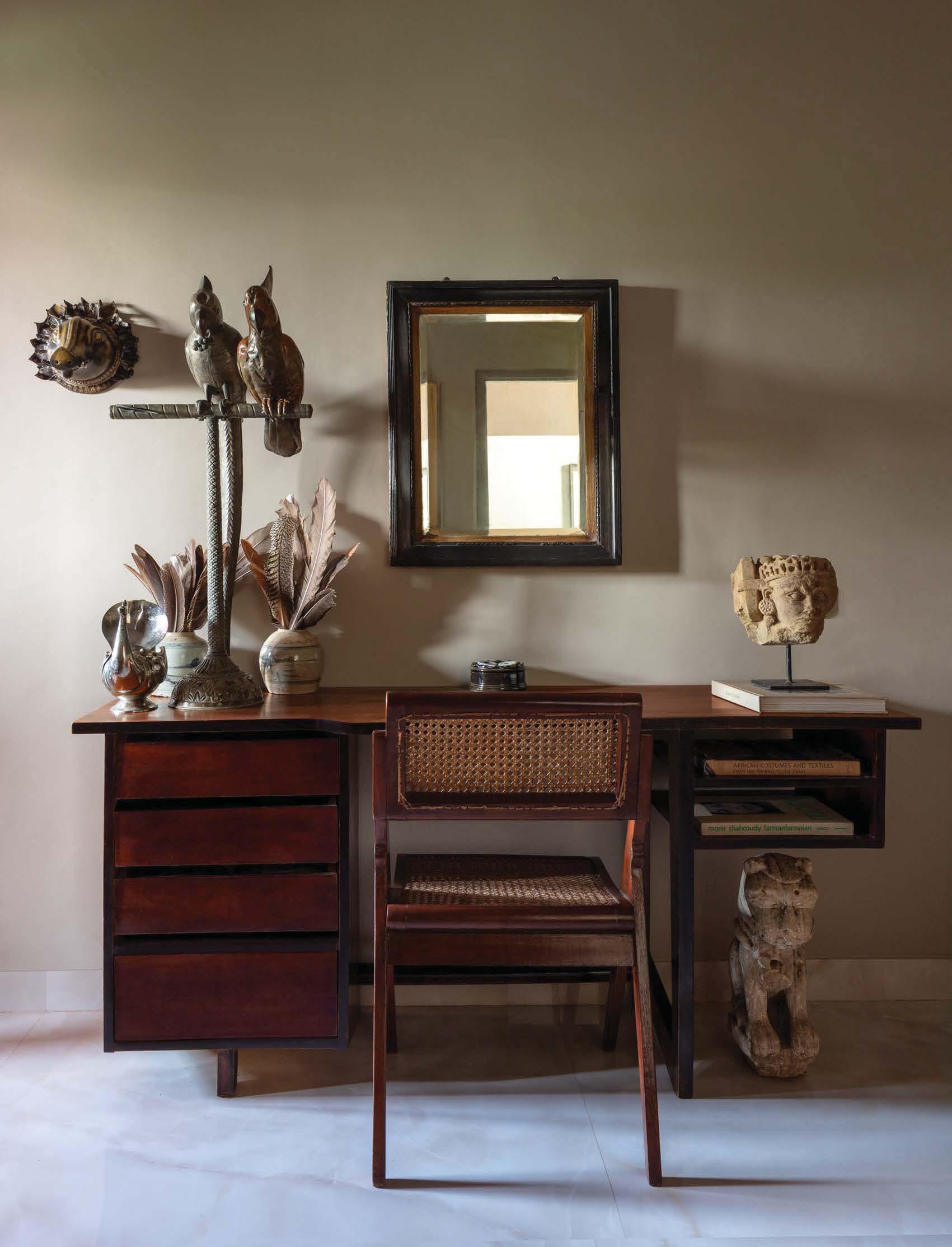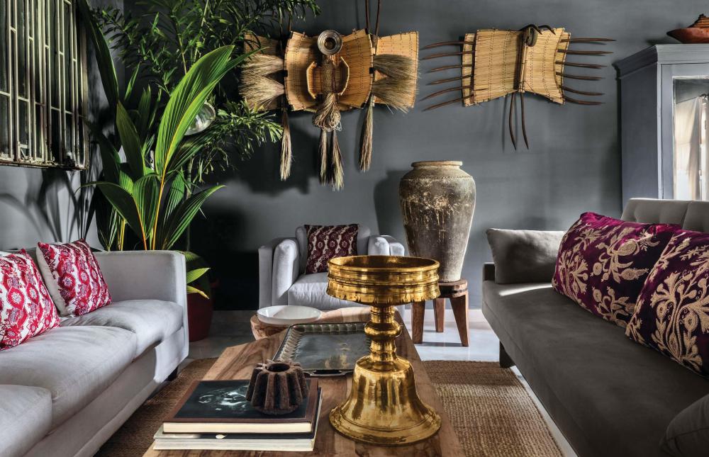 ALL THE LIVING ROOM FURNITURE WAS DESIGNED BY TAHIR HIMSELF, AND EXECUTED AND UPHOLSTERED BY A LOCAL CARPENTER. THE FAR WALL FEATURES A PAIR OF WALL ANGELS" THAT TAHIR CREATED USING STRING AND BAMBOO WINNOWING BASKETS. AHEAD OF IT, A POT SOURCED FROM THE DESERTS OF WESTERN GUJARAT TAKES PRIDE OF PLACE ATOP A NAGA SIDE TABLE. TO THE LEFT, AN OLD WINDOW GRILLE FINDS NEW LIFE AS A WALL INSTALLATION. THE COFFEE TABLE, DESIGNED BY TAHIR FROM A SINGLE BLOCK OF WOOD, DISPLAYS AN ANTIQUE BRONZE BOWL ORIGINALLY USED FOR TEMPLE OFFERINGS, A SILVER FLEA-MARKET TRAY, AND A RUSTED METAL COG-REFASHIONED AS A CANDLE HOLDER-WHICH TAHIR SALVAGED FROM A CAR JUNKYARD.