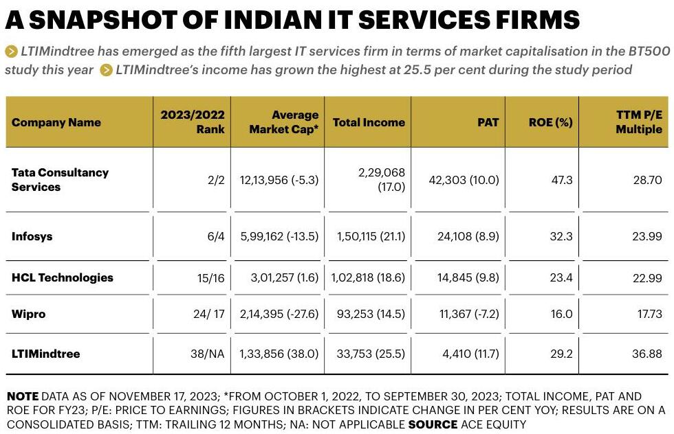 MORE THAN A year after the merger of L&T Infotech and Mindtree created a formidable player in the highly competitive Indian IT space, LTIMindtree—the combined entity—has emerged as the fifth-largest IT services firm in India by market capitalisation in the BT500 study this year. Overall, it has secured the 38th position in the BT500 list. But despite breaking into the top rungs, the company has big plans to grow larger. Debashis Chatterjee, the company’s CEO and MD, says LTIMindtree (LTIM) plans to become a $10-billion enterprise over a period of time. “When we came together as LTIMindtree, we had to set certain goals… where we laid out an aspiration to become a $10-billion enterprise over a period of time,” he said at the Q2FY24 earnings call with analysts.