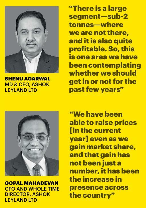 DHEERAJ HINDUJA HAS STEERED COMMERCIAL VEHICLES MAJOR ASHOK LEYLAND OUT OF THE RED LANE AND INTO THE BLACK, GROWING AT A FASTER PACE THAN THE INDUSTRY. THE GROWTH IS LIKELY TO SUSTAIN, EVEN AS THE COMPANY AIMS TO PLUG GAPS IN ITS PORTFOLIO AND PREPARE FOR A MULTI-FUEL FUTURE