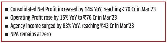 Agency income surged by 83 per cent YoY, reaching ₹43 crore in March 2023. EPS for FY23 stood at ₹14.81 per share. The company continues to maintain strong risk management with net NPA remaining at zero. In addition to its strong results, Abans Holdings outlined its strategic expansion plans, aiming to drive future growth and strengthen its leadership position in key areas as under: