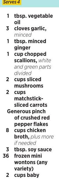 1. In a large pot, heat the oil over medium. Add garlic, ginger and the white parts of the scallions; sauté 1 min. Add mushrooms, carrots and red pepper flakes; sauté 1 min. Add broth and soy sauce and bring to a low boil.