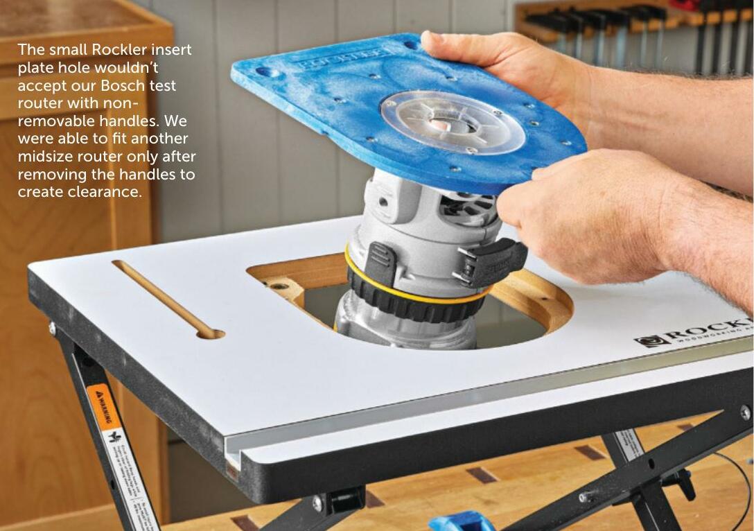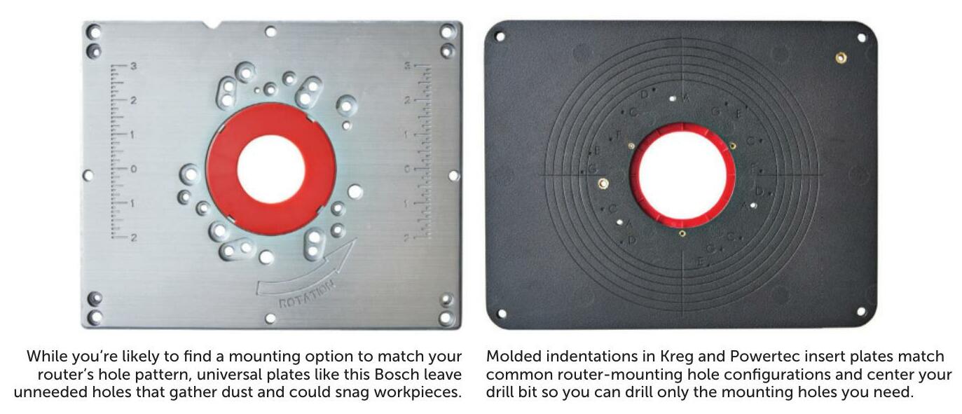 The Bosch RA1141 and the Skil SRT1039 mount the router on a steel plate underneath the table, while the other tested tables hang the router from a drop-in insert plate made from plastic, phenolic, or aluminum.