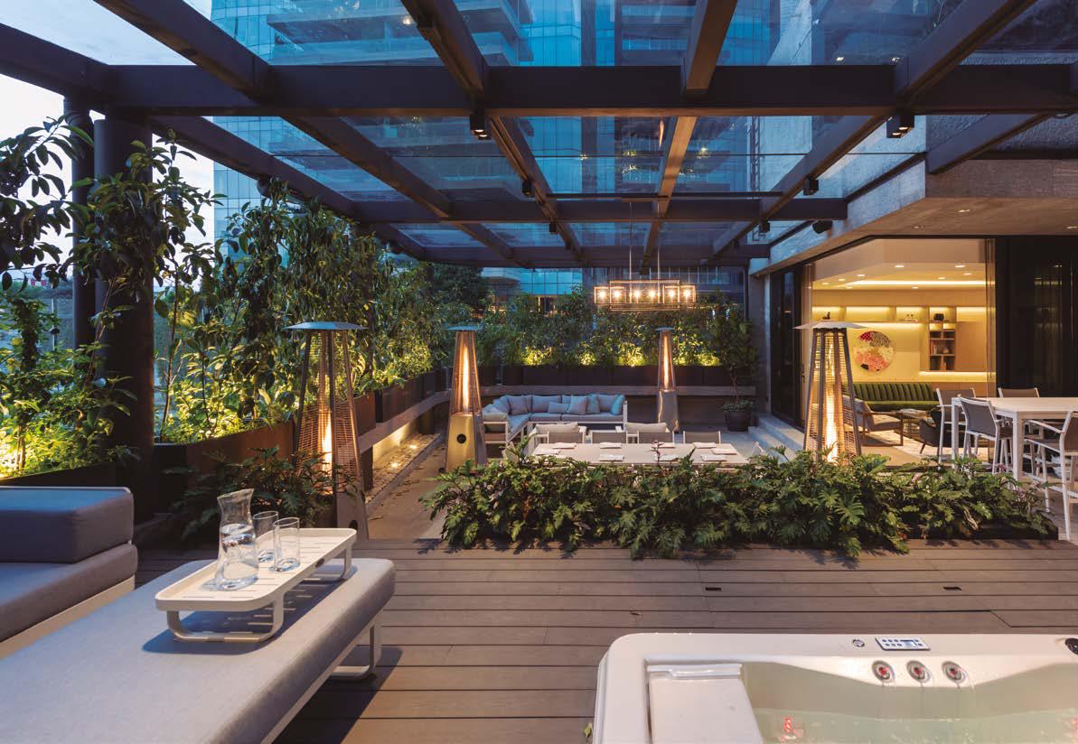 Con vistas de 360° a cerros y sierras, la terraza conecta con el horizonte. En contraste, el interior ofrece atmósferas rojizas y patios ajardinados que invitan a una vida íntima y pausada.