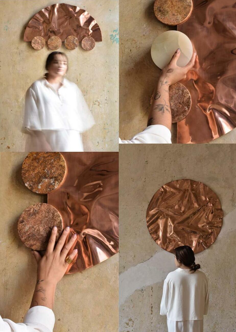 Estero es el lugar donde el mar y el río se conocieron. Esta pieza escultórica de cobre y mármol nos transmite la sutileza y autenticidad de cada ola de mar; el vaivén de la marea nos recuerda la singularidad de cada momento, al permitirnos ser cautivados por la sutileza de las formas limpias y simples. El contraste de materiales, texturas y colores generan una pieza que se vuelve protagónica.