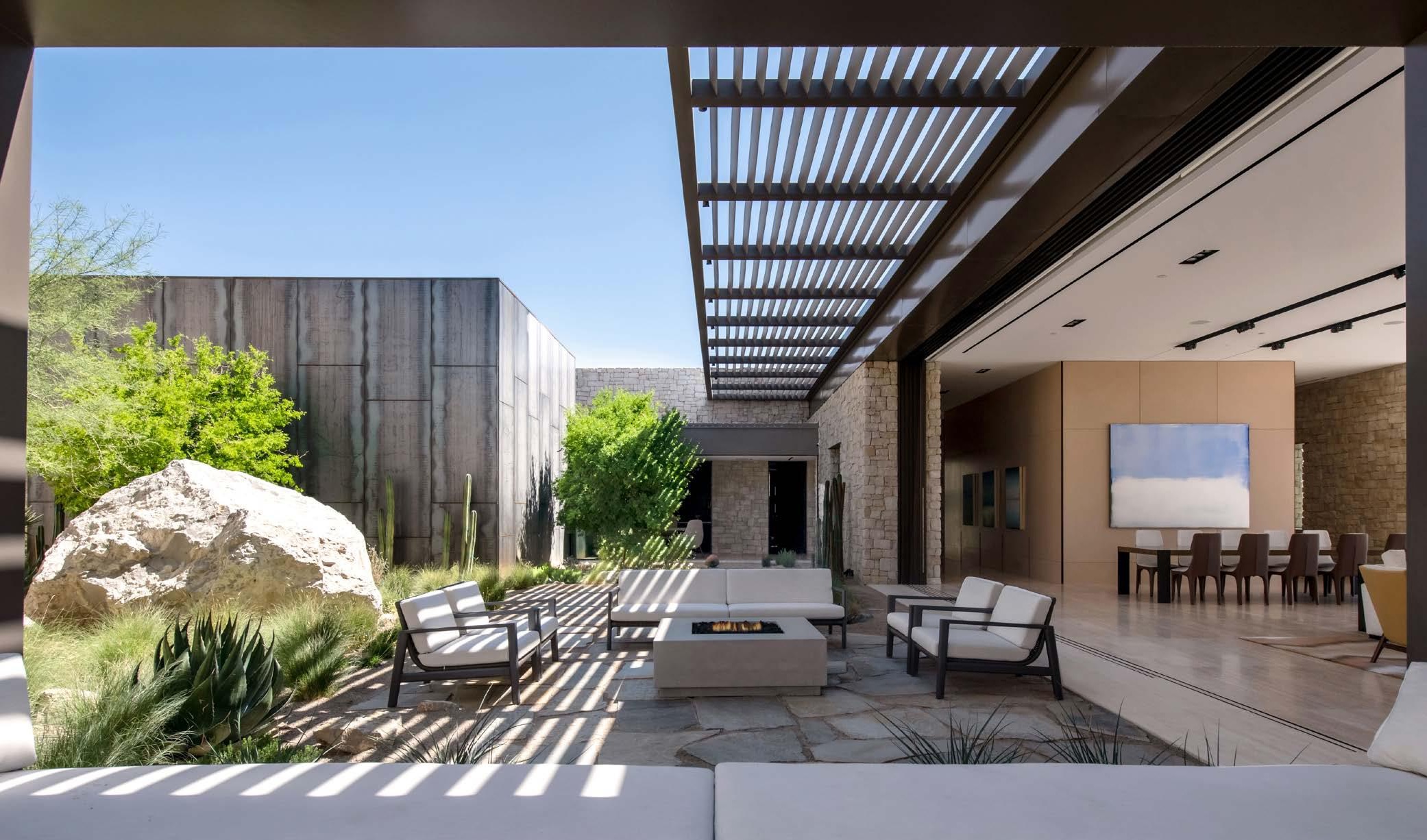 Con vistas de 360° a cerros y sierras, la terraza conecta con el horizonte. En contraste, el interior ofrece atmósferas rojizas y patios ajardinados que invitan a una vida íntima y pausada.