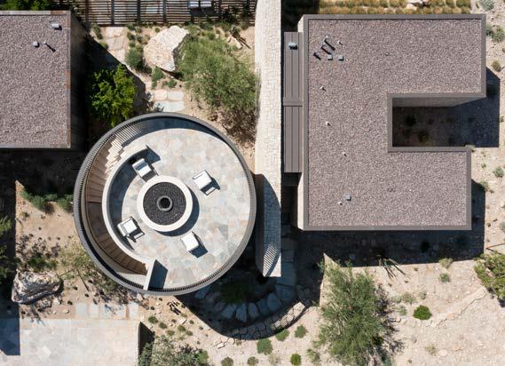 Además de un programa interior que incluye una suite principal, una suite secundaria, tres dormitorios adicionales y una gran sala de estar y comedor comunales, la construcción de 15 meses priorizó un enfoque externo que incluye una rotonda de entrada, un patio sombreado y un marco con vistas al paisaje circundante.