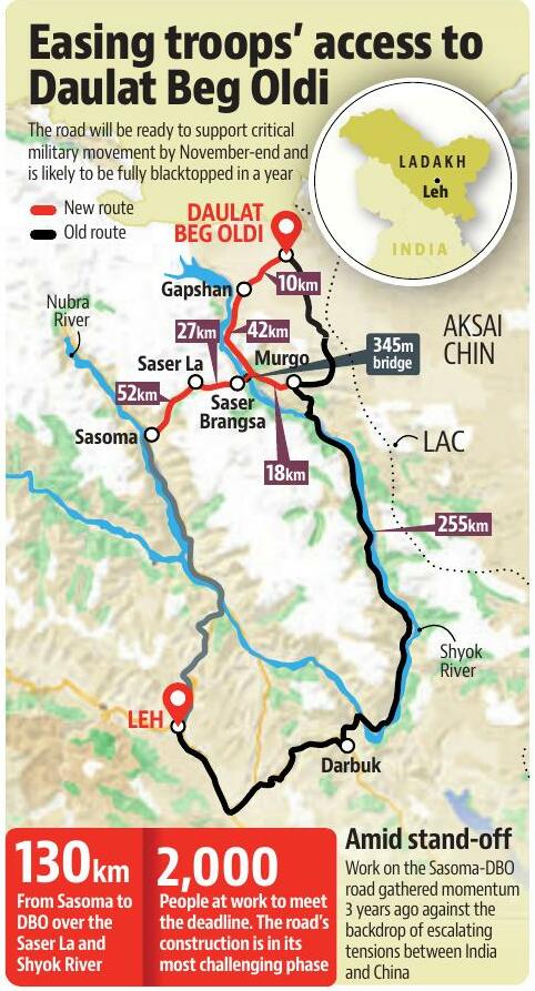 Work on the Sasoma-Saser La-Saser Brangsa-Gapshan-DBO road gathered momentum three years ago in the backdrop of escalating military tensions between India and China: the two countries have been locked in a standoff since May 2020 and a full resolution of the border crisis through ongoing negotiations still appears elusive.