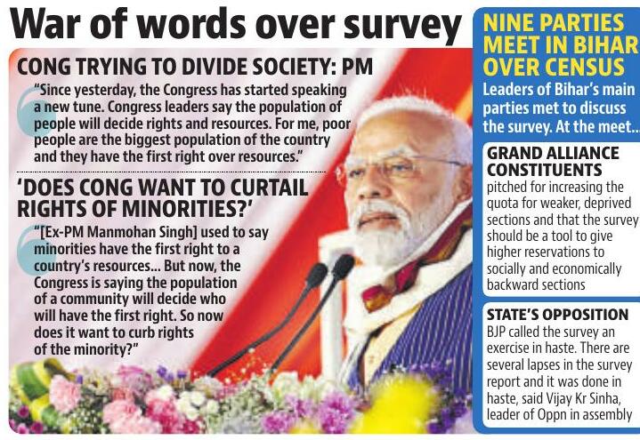 Prime Minister Narendra Modi on Tuesday accused the Congress of trying to divide society through its call of apportioning resources proportional to the demographic weight of communities, and asked if it was advocating for curtailing the rights of minorities, marking his first response to Bihar's landmark caste survey that has the potential to upend heartland politics and trigger a churn in key caste groups.