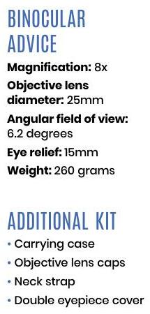 Stylish and versatile, the Olympus 8x25 WP II binocular is built with the outdoor explorer in mind, featuring a nitrogen filled fogproof and waterproof design that promises to breeze through even the most inclement weather. It is also lightweight and comfortable to hold thanks to a rubber-coated finish and weight of just 260 grams (9.2 oz). For even more ease of use while travelling, the Olympus 8x25 WP II can be folded away and slotted into the carry case. A neck strap is included for those needing to achieve magnified views without fumbling to unpack this piece of kit. A grooved central knob for focusing makes this a winner for observers wanting to just get viewing without any complications.