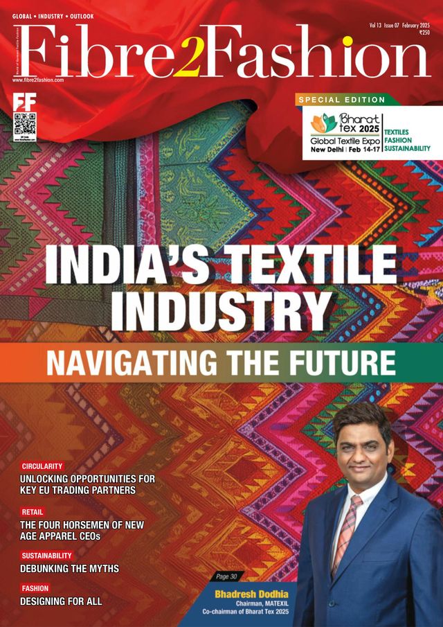 The February 2025 edition of Fibre2Fashion magazine is dedicated to Bharat Tex 2025, a landmark event poised to elevate India’s position in the global textile industry. The cover story, Navigating the Future, explores key challenges, government initiatives, and emerging opportunities in synthetic fibres, technical textiles, and renewable energy. Additionally, with thought-provoking articles on the EU’s Circular Textiles Policy, the evolving role of apparel CEOs, and other topics, this edition unravels the key trends shaping the textile and apparel sector.