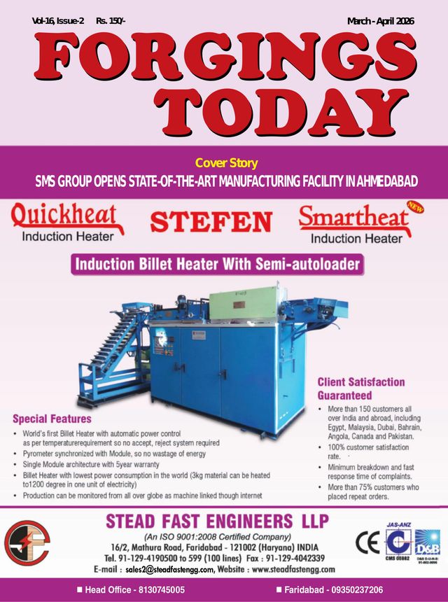 FORGINGS TODAY is India first and only magazine exclusively devoted to metal forging and allied industrial sectors. Forgings Today, a bimonthly publication, provide a platform to all stake holders to share information. While retaining its identity primarily as a print media, it would not be limited to that. Forgings Today’s long term vision includes dissemination of information through Seminars, Workshops, Conferences, Exhibitions, other audio visual means.