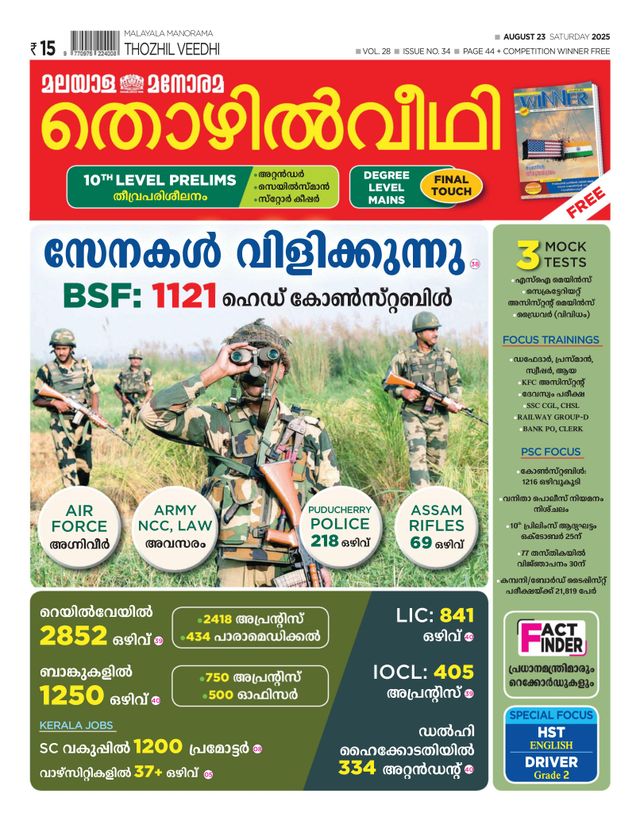 Thozhilveedhi is Kerala’s leading Malayalam employment weekly, providing the latest job vacancies, career guidance, and competitive exam resources to job seekers across the state. Whether you're a student, a government job aspirant, or a professional looking for career growth, Thozhilveedhi is your go-to source for reliable employment updates.