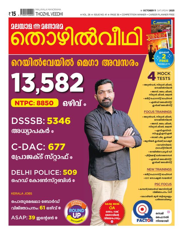Thozhilveedhi is Kerala’s leading Malayalam employment weekly, providing the latest job vacancies, career guidance, and competitive exam resources to job seekers across the state. Whether you're a student, a government job aspirant, or a professional looking for career growth, Thozhilveedhi is your go-to source for reliable employment updates.