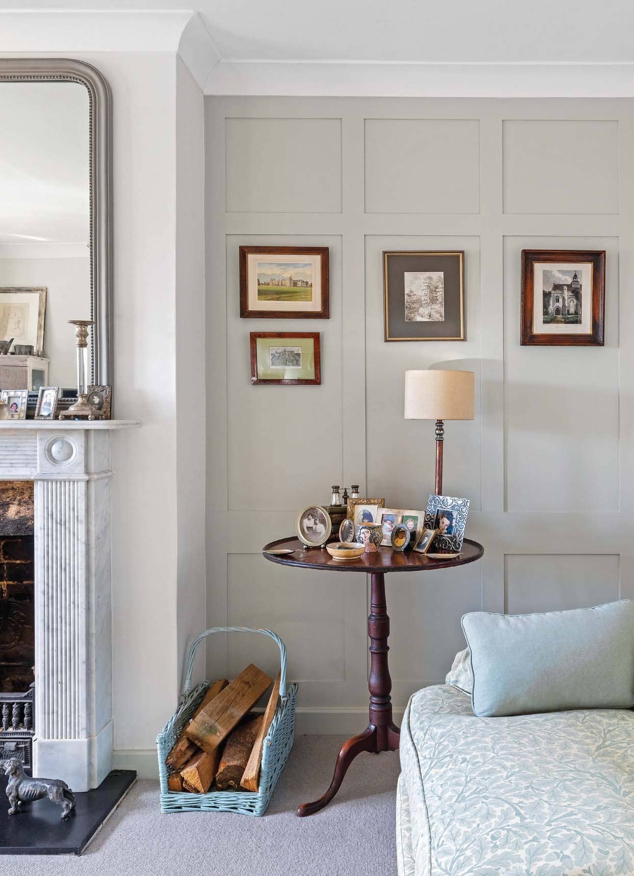 Walls in Strong White estate emulsion, £49.50 for 2.5ltr; panelling in Shadow White estate eggshell, £67 for 2.5ltr, both Farrow & Ball. Antique French style overmantel mirror, £369, Homes Direct 365, would work here. For log carrier baskets, from £48, try Marquis & Dawe