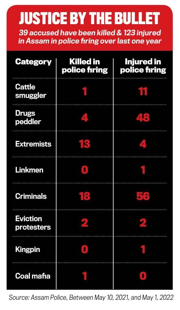 It wasn’t the first time. The Gauhati High Court has already been hearing a petition against alleged fake encounters in the state. Filed in December last year, the petition claimed that since May 2021, when Himanta Biswa Sarma took charge as the chief minister of Assam, 80 incidents of fake encounters had taken place in the state—leaving 28 people killed, 48 injured. (The numbers have gone up since then. By May 1, 2022, government data put the death toll at 39, and there were 123 injured.) In an affidavit filed before the court in February 2022, the state government said all legal and NHRC (National Human Rights Commission) guidelines were being adhered to in all such cases. But even the regime would gladly own up to the perception of a ‘no-nonsense’ approach to law-keeping it exudes.