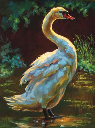 Graceful Elegance, oil on board, 24 x 18" (60 x 45 cm) Graceful Elegance was inspired by a friend's photo of a swan. It is painted both in brush and palette knife. I've used the brush for the swan and a palette knife and brush for the water. I did some dry brush dragging in the water too, to help it read. I used the grass to the right to lead your eye into the swan and the path of light. My eye goes up its neck to the head, which is the focal point. Then the eye travels down the swan to the water and back around. I've used the elements of the light and reflection on the water to keep the viewers' attention in the painting.