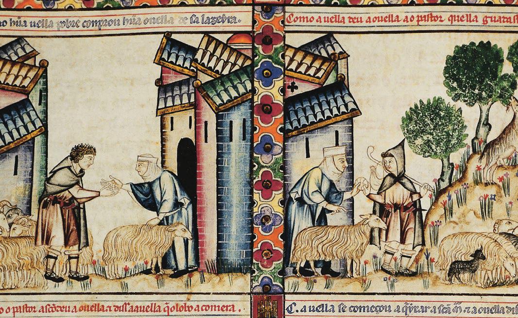 ANIMALES EN TRÁNSITO. La trashumancia era una de las formas de viaje practicadas con mayor frecuencia durante la Edad Media. Arriba, miniaturas con ovejas, de las Cantigas de Santa María, escritas en en la corte del rey Alfonso X el Sabio durante la segunda mitad del siglo XIII.